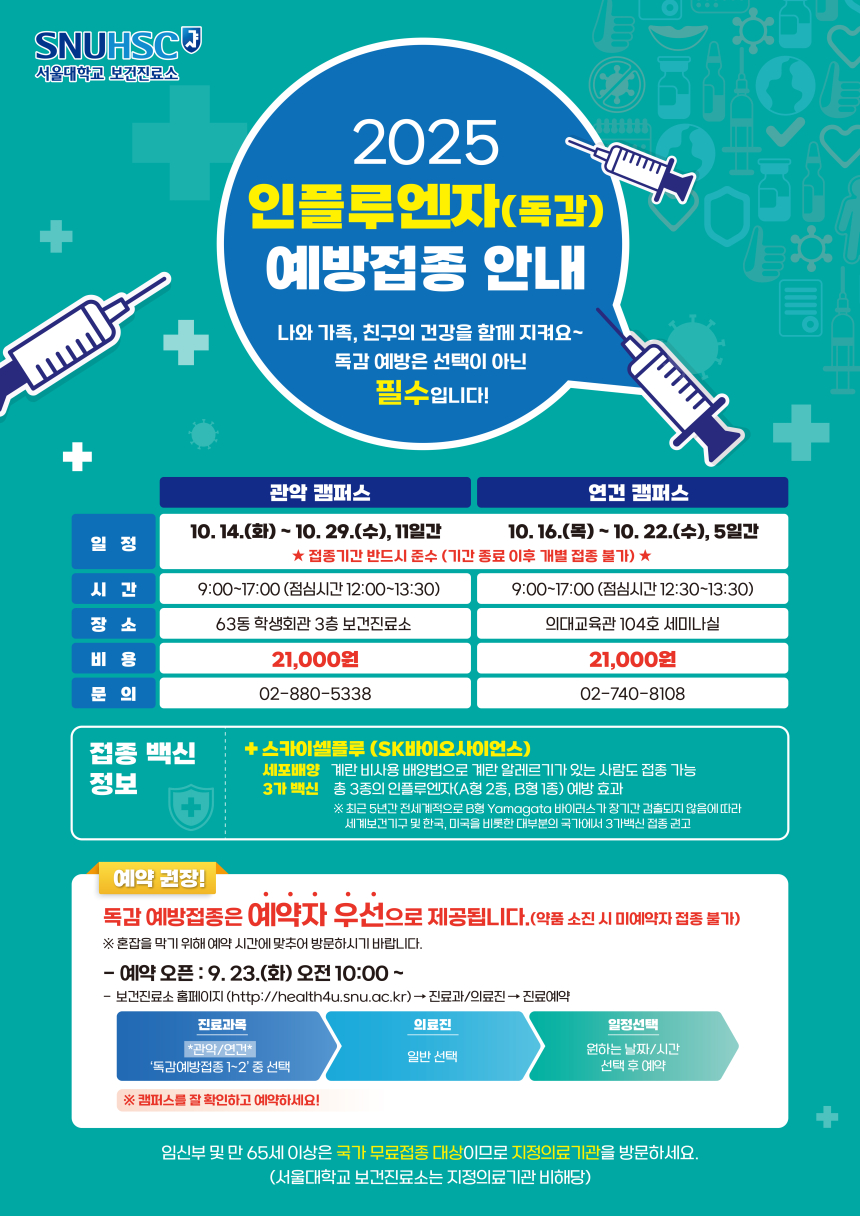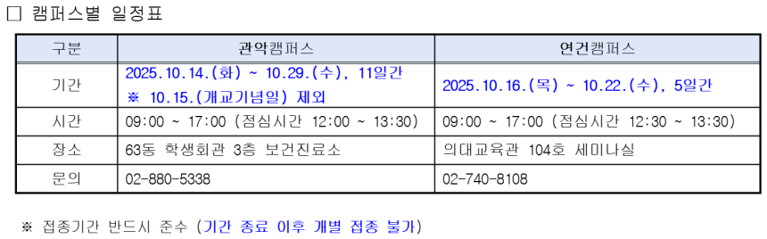 - 진료과목: 관악/연건 독감예방접종 중 선택 (※캠퍼스 선택에 유의)