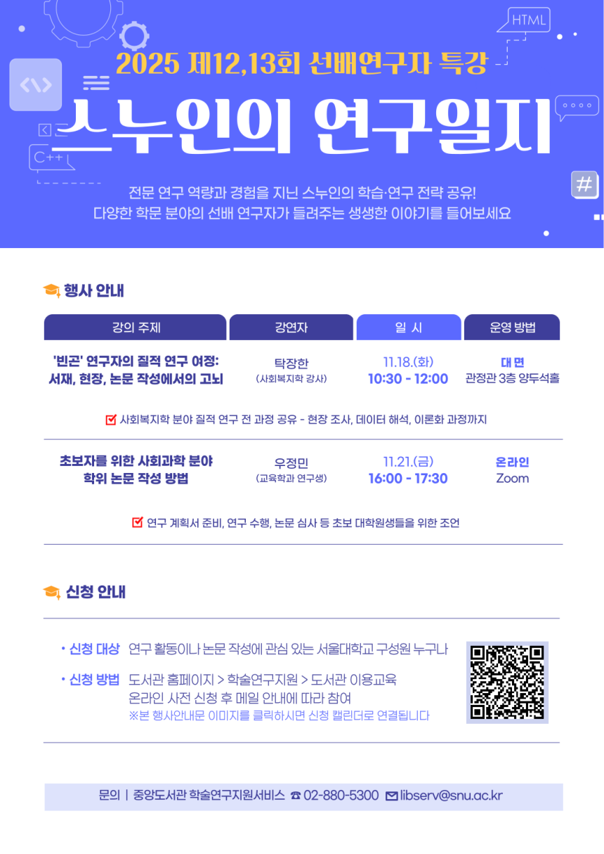붙임 제12,13회 선배 연구자 특강 「스누인의 연구일지」 홍보 이미지(QR코드 포함) 1부.
