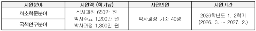 - (신규) 2026학년도 1학기 기준 수학 중인 석사 재학생, 박사 재학생(수료생 포함) 중 타 장학금의 지원을 받지 않는 자로서 희소학문분야 및 국책분야를 연구하는 학생