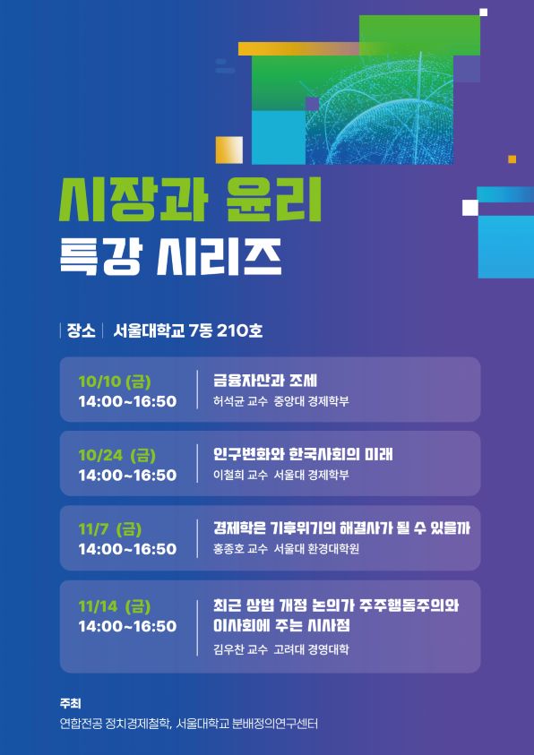 서울대학교 분배정의연구센터와 인문대 연합전공 정치경제철학이 공동으로 주최하는 [시장과 윤리 특강시리즈]가 오는 10월 10일 금요일부터 4회에 걸쳐 진행됩니다.