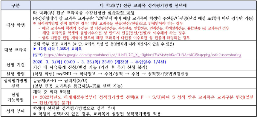 [수업] 2026학년도 1학기 타 학과(부) 전공 교과목 성적평가방법 선택제 신청 안내(~3/26)